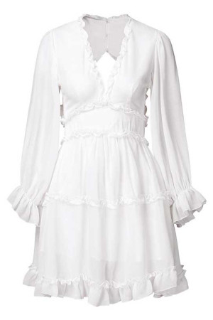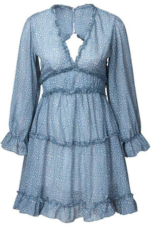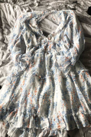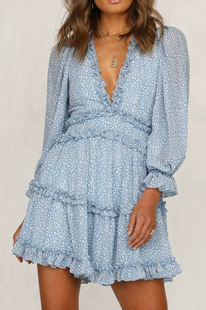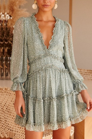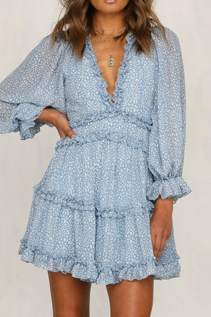 This item is a summer dress made of chiffon with a V-neck, full length sleeves, ruffles, a natural waistline, and a print pattern. It has a vintage, elegant, casual, European, simple, and bohemian style, and is suitable for holidays, beaches, daily wear.