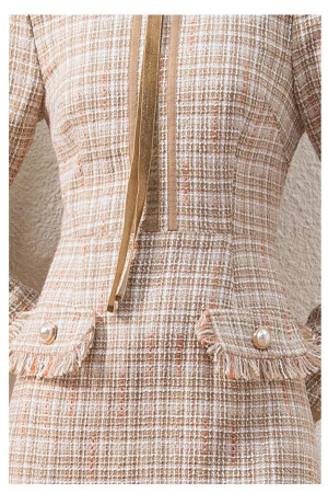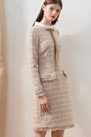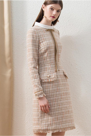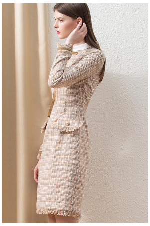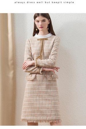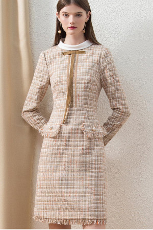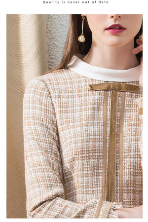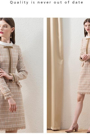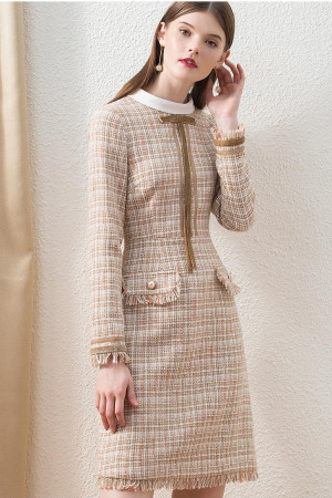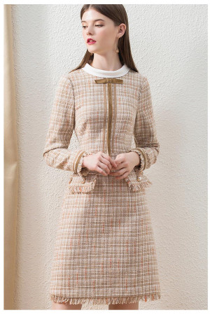 This winter office lady look features a plaid A-line dress made of a lanon and polyester blend. It has a natural waistline, full length petal sleeves, an O-neckline, and tassel decoration.