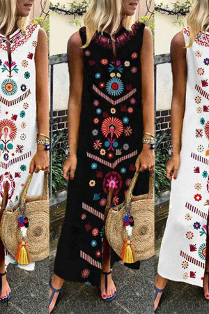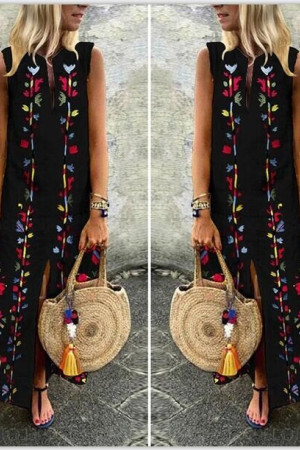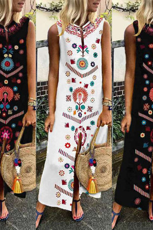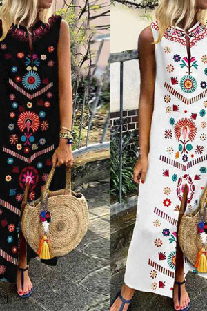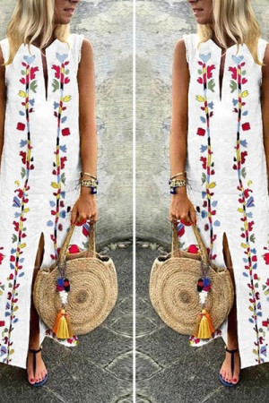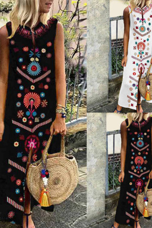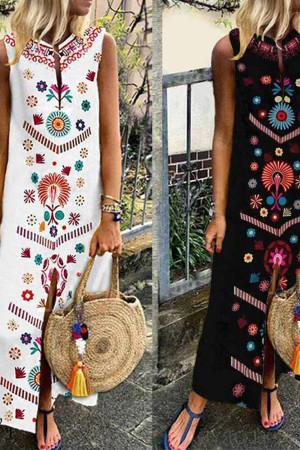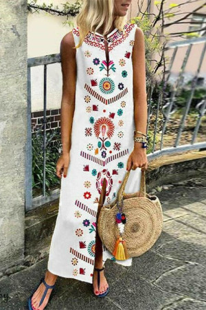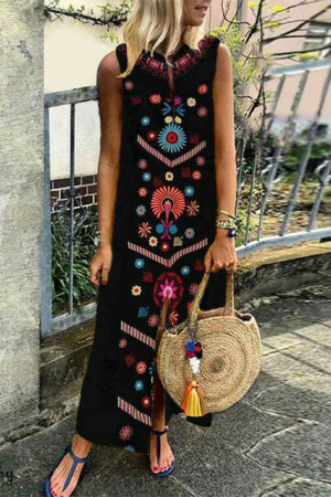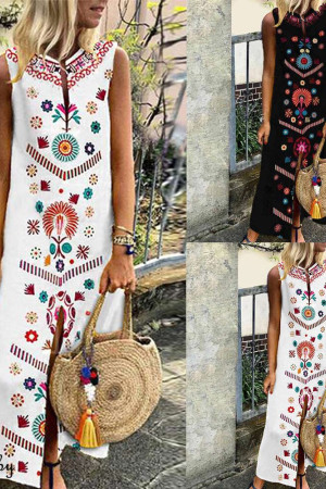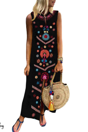 This is a bohemian-style summer dress made of cotton and polyester with a straight silhouette, print pattern, sleeveless tank style, natural waistline, and V-neck neckline. It has no decorations.