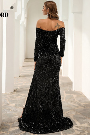 This dress is perfect for any special occasion in the autumn season. It features a solid pattern, regular sleeve style, full sleeve length, sequined decoration, empire waistline, polyester material, sheath silhouette, and a slash neck style. It is sexy and club-ready, perfect for a wedding, party, cocktail, or anniversary.