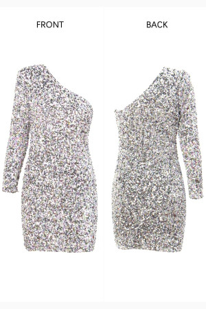 Glamorous One Shoulder Silver Sequins Party Mini Dress