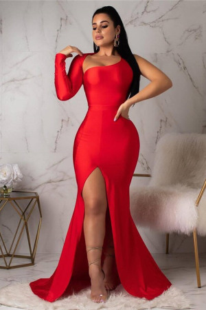 Glamorous One-Shoulder High-Split Maxi Dress - Solid Black, Red, and Blue
