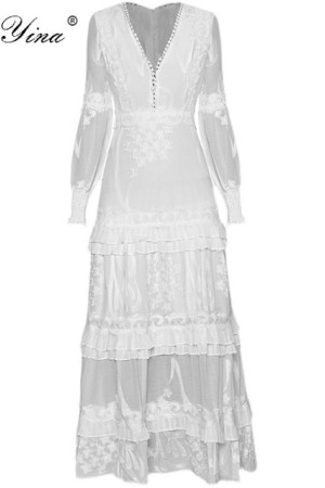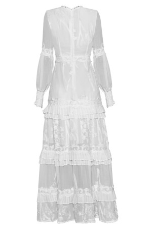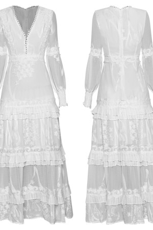 Elegant Spring Vacation Dress with Embroidered Flowers and Cascading Ruffles
