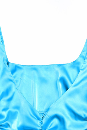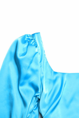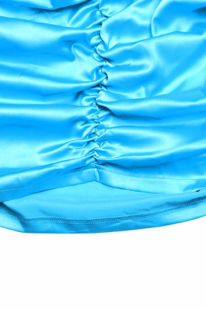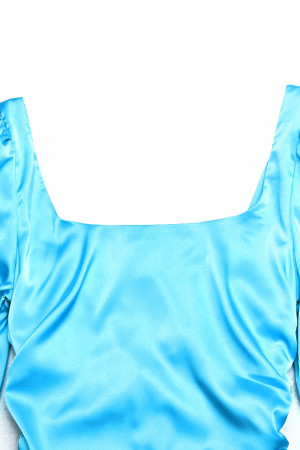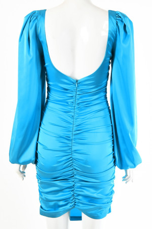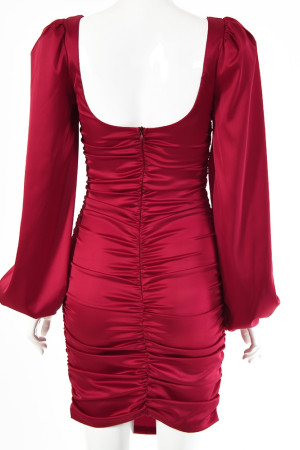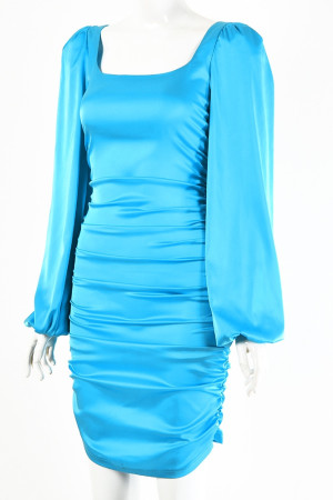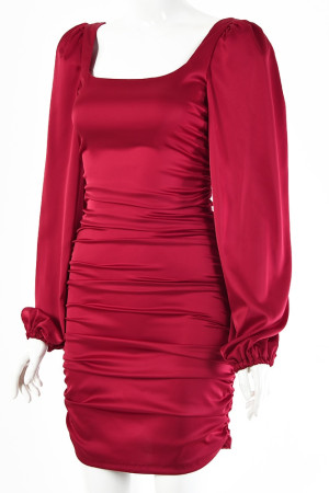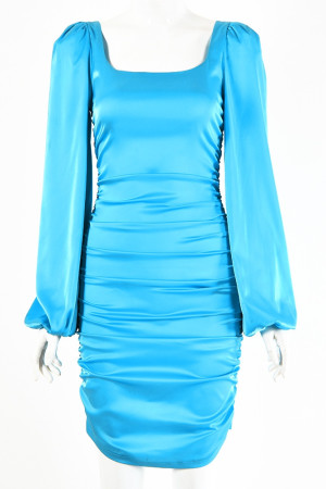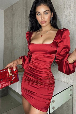 Autumn Elegance: Satin Mini Dress with Solid Lantern Long Sleeve, Square Collar, and Ruched...