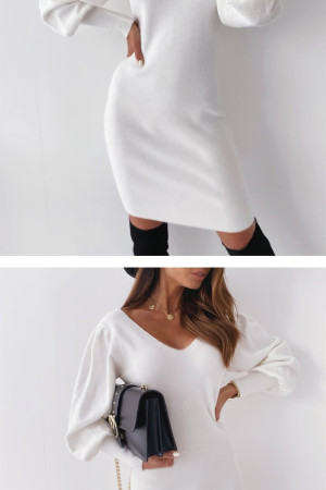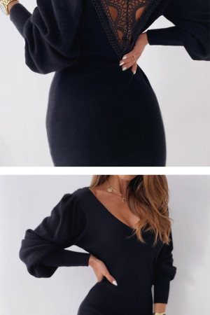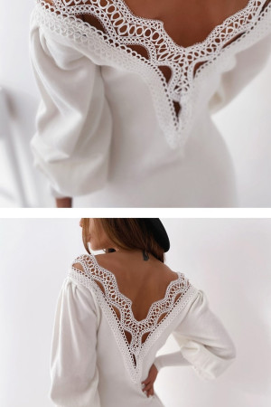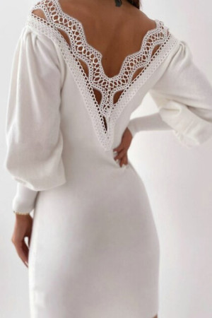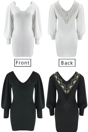 Elegant White Winter Party Dress with Black Lace Openback Lantern Sleeve V-Neck Sweater for...