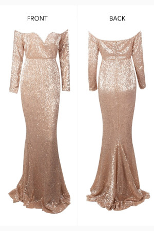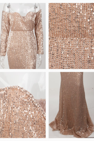 Glamorous Plus Size Rose Gold Deep V-Neck Off-the-Shoulder Bodycon Elastic Sequins Maxi Dress
