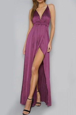Royal Elegance: Purple Plunging Crisscross Lace Up Backless Slit Maxi Dress