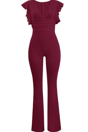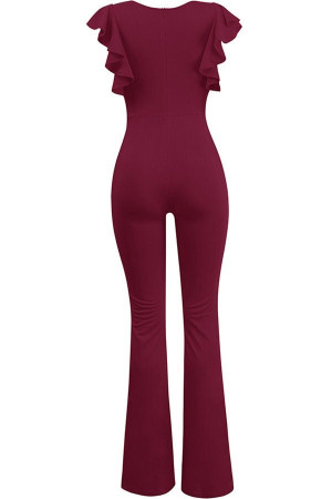 This jumpsuit features a dark-red color, plunging neckline, ruffles trim, ruched detailing, and a zipper closure. It is a stylish and flattering piece perfect for any occasion.