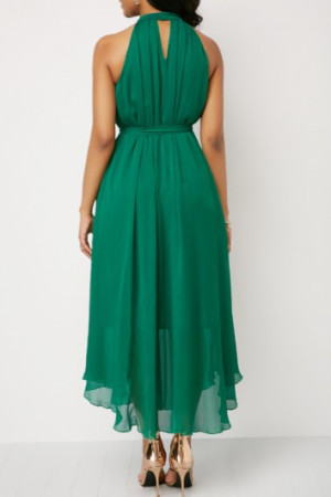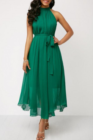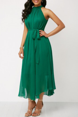 Elegant Emerald Ruched High Waist Belted Sleeveless Dress