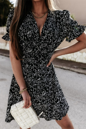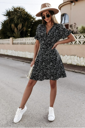This summer streetwear look features a V-neck, regular sleeve style, button decoration, and a single breasted closure. It is made of a polyester and spandex blend, with an A-line silhouette, short sleeve length, regular type, natural waistline, and a print pattern.