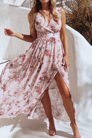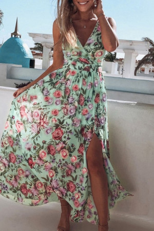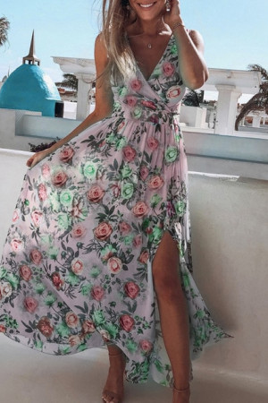 This summer beach style dress is made from polyester and features a sexy casual look. It has an A-line silhouette, a V-neck neckline, spaghetti straps, and an empire waistline. The pattern is a floral print, and there is no decoration.