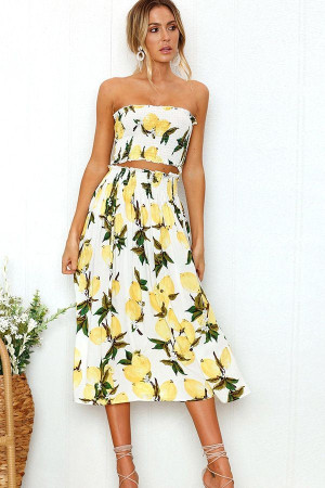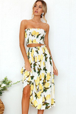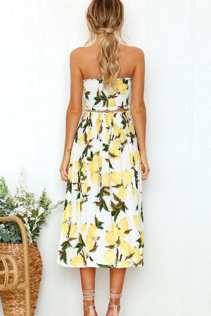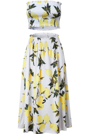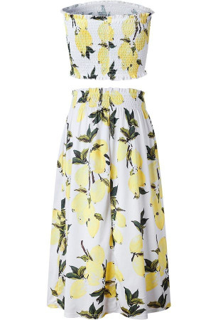 Fresh & Flirty White Lemon Shirred Bandeau Pleated Two Piece Dress