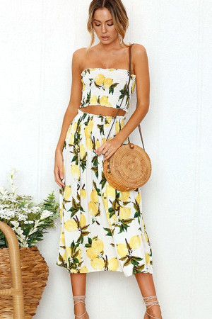 This two-piece dress is made of 81%-90% polyester and 10%-19% spandex, and is available in sizes S, M, L, and XL. It has a midi length, a strapless neckline, and a backless design. It is embellished with pleats and prints, and is available in leaf and lemon patterns. It is suitable for beach, daily, going out, holiday/vacation, and street occasions, and is suitable for summer wear. The bust size for S is 26.8"-33.9", M is 28.7"-35.8", L is 30.7"-37.8", and XL is 32.7"-39.8".