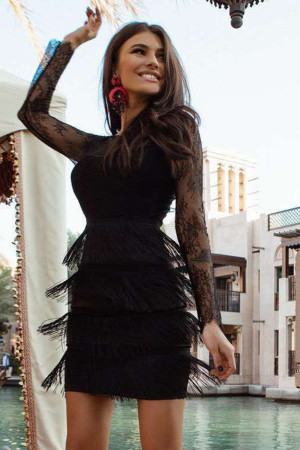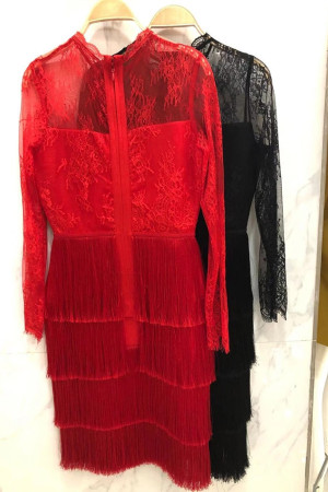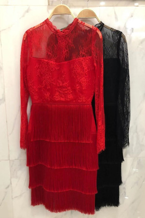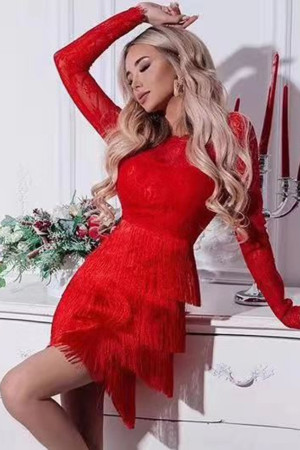 This garment is made of a combination of nylon, rayon, and spandex, and features a tassel decoration, a natural waistline, a sexy and club style, a sheath silhouette, full sleeve length, a solid pattern type, an O-neck, regular sleeve style, and a colour combination of black and red. It is suitable for the spring, autumn, and winter seasons.