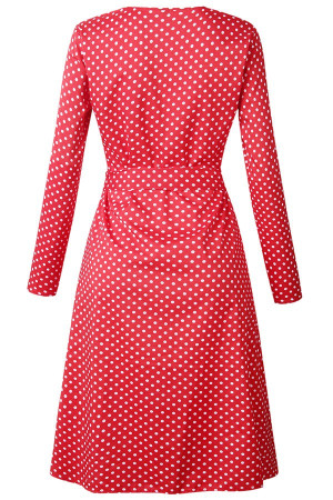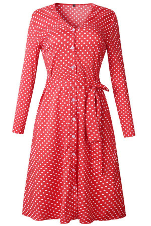 Women's & Fun: Red Polka Dot Button Up Tied Long Sleeve A Line Dress