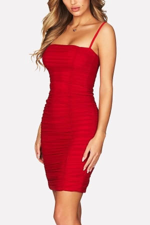 Sultry Red Ruched Spaghetti Strap Bodycon Dress