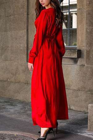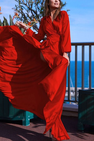 Elegant Red V-Neck Wrap Dress with Long Sleeves and Side Slits