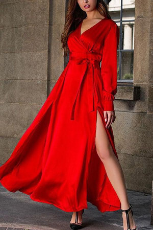 This dress is a red v-neck wrap dress with long sleeves and a slit on each side. It is made of a lightweight fabric and is perfect for a night out or a special occasion. It is stylish and flattering, making it a great addition to any wardrobe.