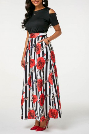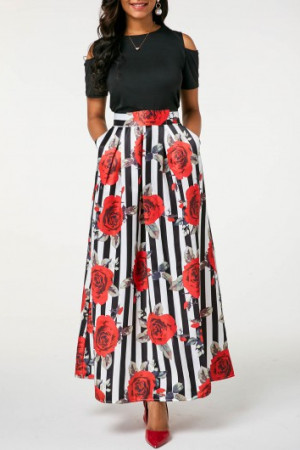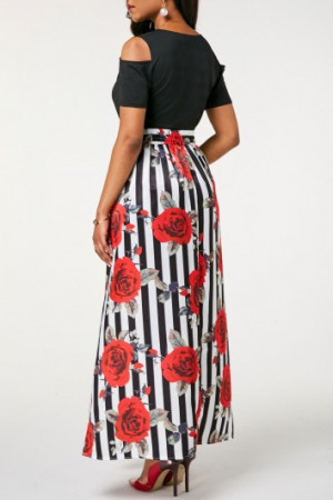 Rose-Colored Elegance: High Waist Cold Shoulder Maxi Dress