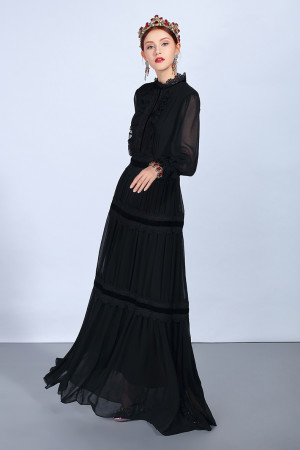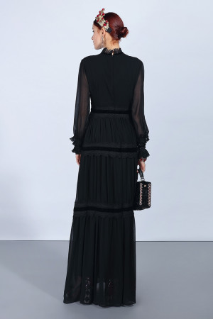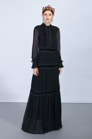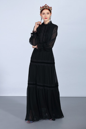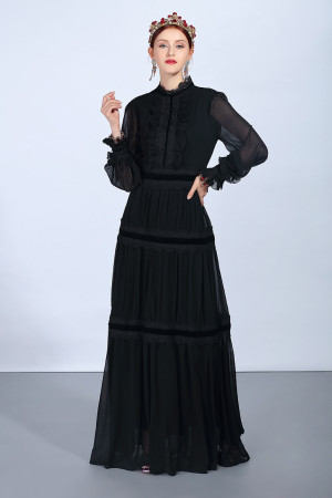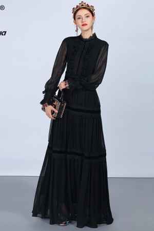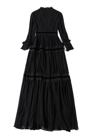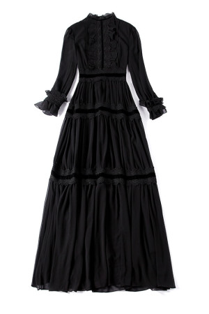 Vintage Elegance: Black Lace Patchwork Maxi Dress with Long Sleeves and Ruffles