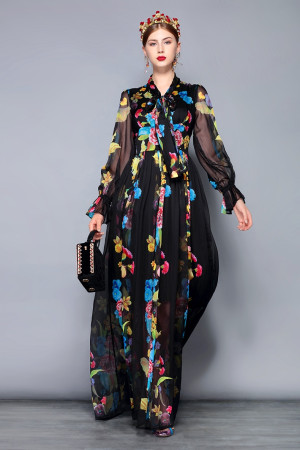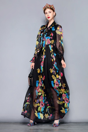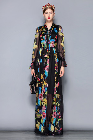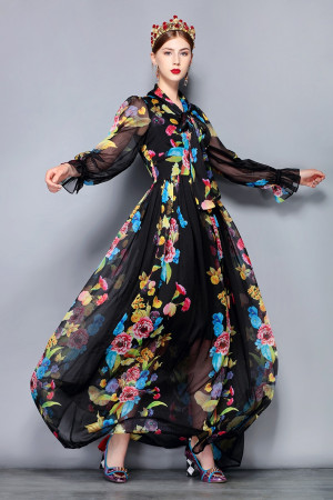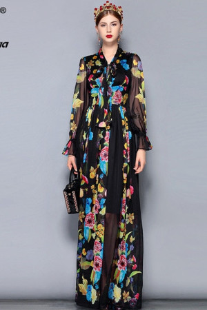 Vintage Floral Chiffon Maxi Dress - Plus Size, Bow Collar, Long Sleeve, Perfect for Parties &...