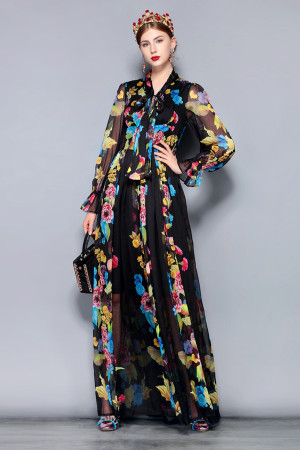 This vintage-style dress is made of chiffon, polyester, and cotton and features an A-line silhouette, a bow neckline, full-length sleeves, a bow decoration, and a natural waistline with a floral pattern. It is suitable for summer wear.
