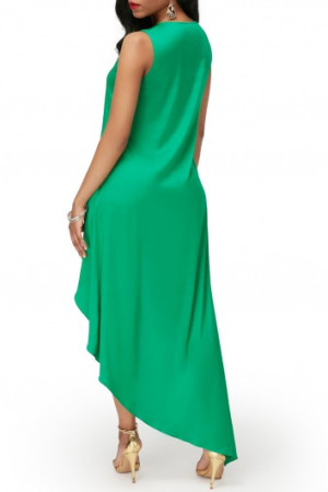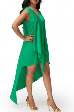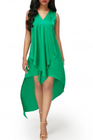 This sleeveless green dress features an asymmetric hem and a V-neckline. It is perfect for any special occasion and will make a statement with its unique silhouette. The dress is made from a lightweight fabric, making it comfortable and easy to wear.