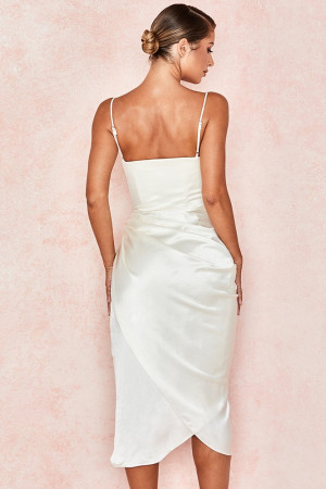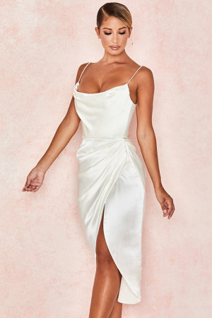 Autumn Winter Elegance: Solid Stain Strap Midi Dress with High Slit and Ruched Bodycon for...