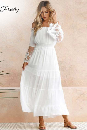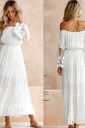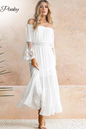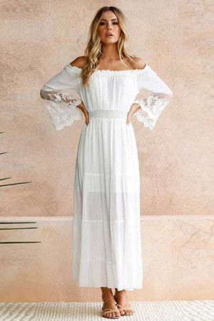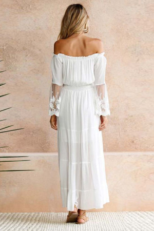 This is a bohemian-style summer dress with an A-line silhouette and empire waistline, made of chiffon, polyester and lace. It features a full-length flare sleeve, a slash neckline and a solid pattern.