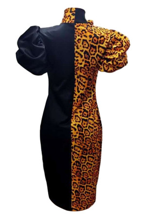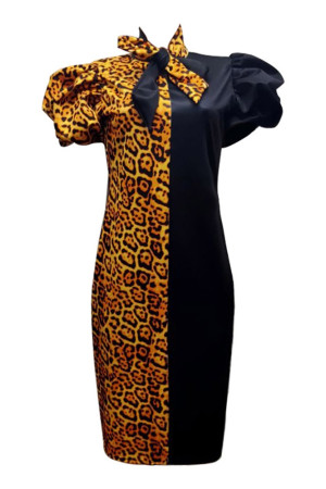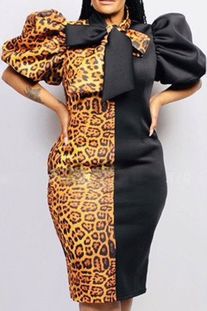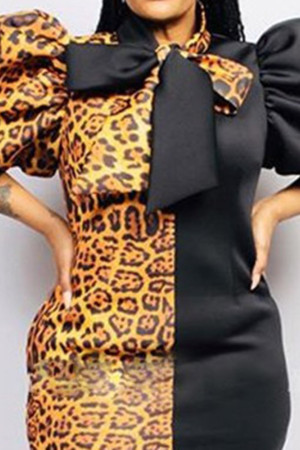 This vintage-style dress is made of polyester and features a pencil silhouette with a bow neckline, short puff sleeves, a natural waistline, and a leopard pattern. It has a high waistline, a pullover closure, moderate elasticity, and pleated, patchwork, print, and bowknot embellishments. It is suitable for indoor wear.