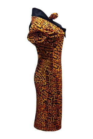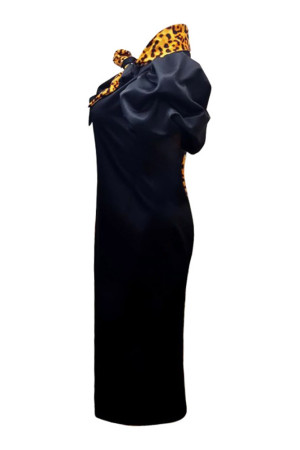 Vintage Leopard-Print Color Block Bowtie Collar Autumn Plus Size Midi Dress