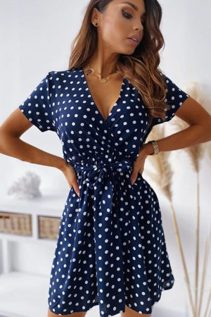 This summer casual dress is made of polyester with a chemical fiber fabric type and natural fiber material composition. It features a V-neck, regular sleeve style, short sleeve length, pullover closure, A-line silhouette, A profile type, sashes decoration, and a dot pattern type. Wholesales are accepted.