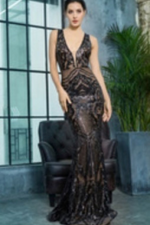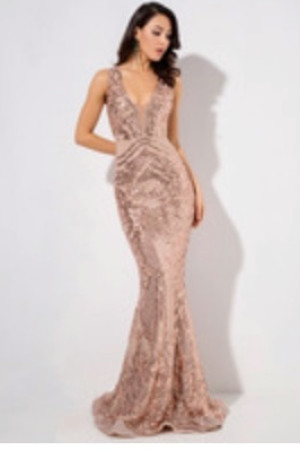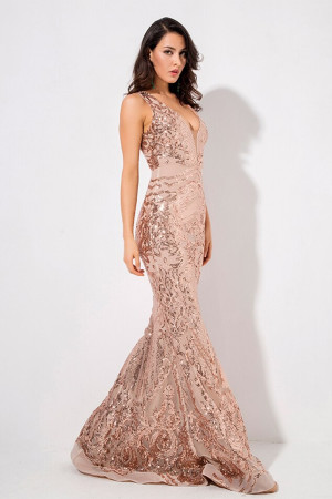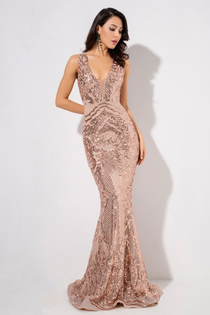 Rose Gold Sparkle: Deep Vneck Sleeveless Dress with Geometric Sequins and Mesh Lining