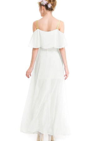 Elegant White Cold Shoulder Maxi Dress with Ruffles and Pleats
