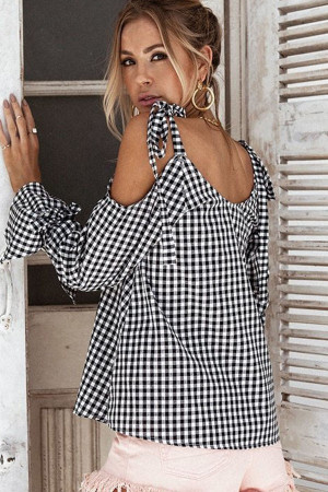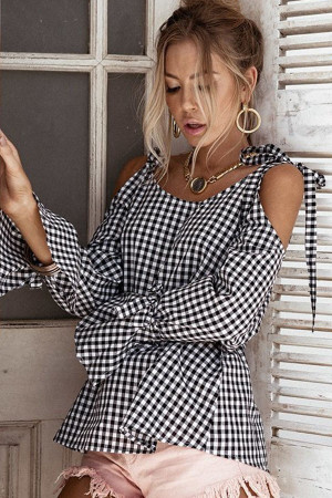 Chic Black & White Plaid Cold Shoulder Flare Sleeve Blouse