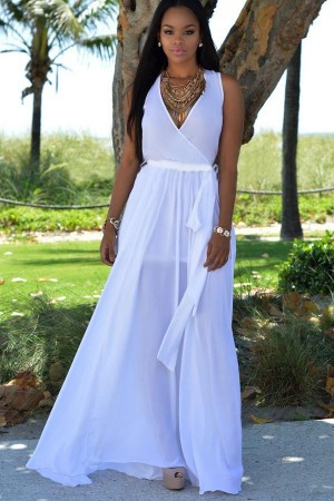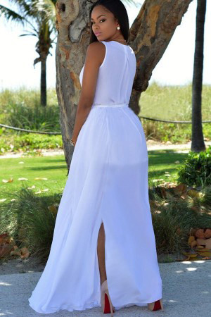 Elegant White Sleeveless V Neck Maxi Chiffon Dress