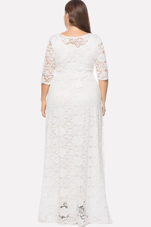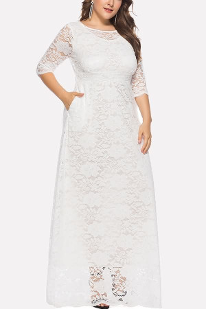 Elegant White Half Sleeve Lace Plus Size Dress with Pockets