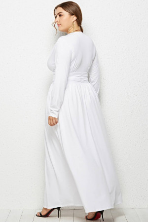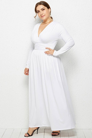 Elegant White Ruched V-Neck Long Sleeve Maxi Dress for Plus Size Women