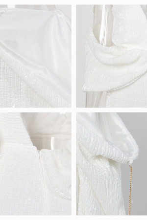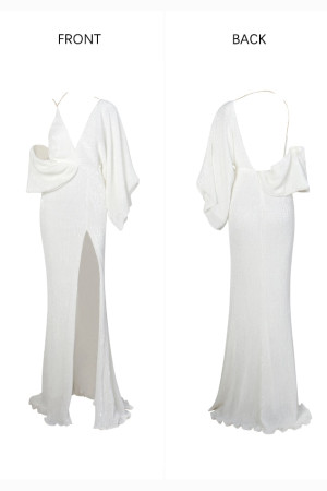 Sparkling White V-Neck Single Sleeve Sequined Split Maxi Dress for Parties