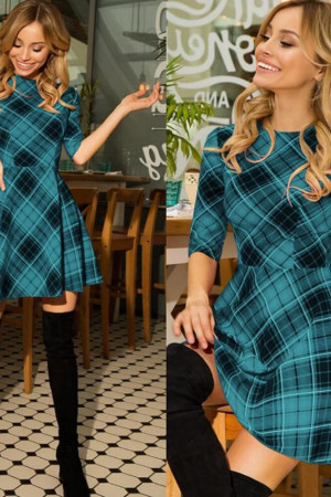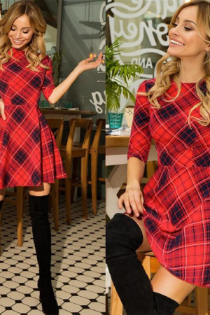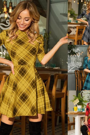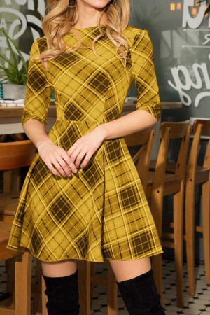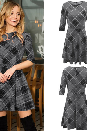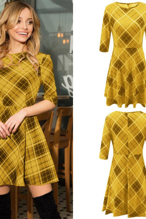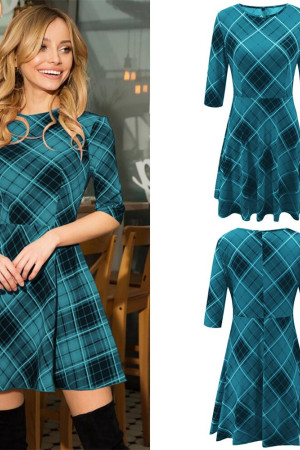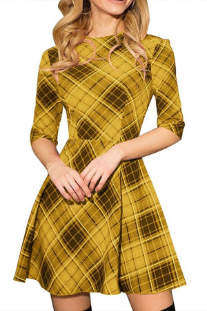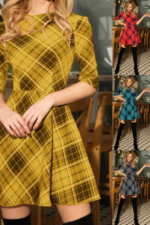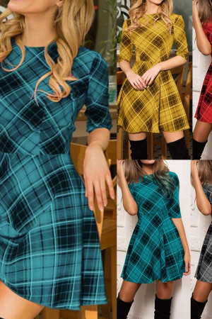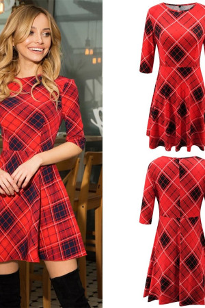 This casual A-line dress is perfect for autumn. It is made of polyester and features an O-neck, half-length sleeves with a regular style, and a natural waistline. The dress is decorated with a plaid pattern and has no other decorations.