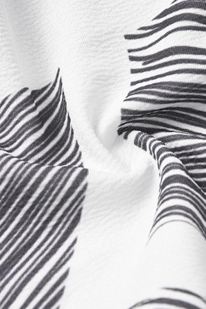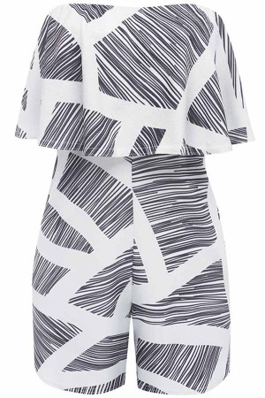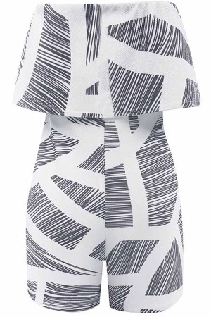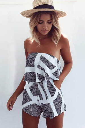 Chic Black & White Striped Strapless Romper with Ruffled Accents