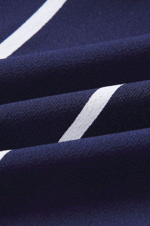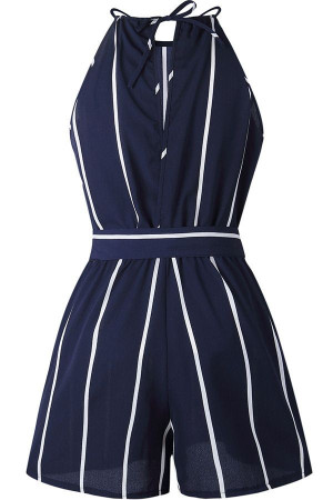 The High-Neck Striped Romper is a stylish and comfortable one-piece outfit for women. Made of polyester blended fabric, this sleeveless romper features a high neckline with a tie closure and an adjustable strap. Perfect for a casual summer occasion, it includes a belt and has a wide-leg style for a flattering fit. Easy to care for, machine washable, this romper is a must-have addition to any woman's wardrobe.