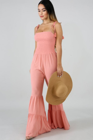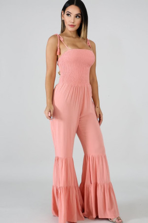 Pink Flared Shirred Tassels and Ruffles Jumpsuit