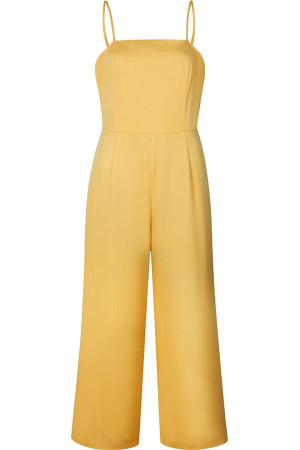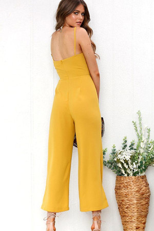 This casual jumpsuit features yellow spaghetti straps, a zipper closure, and wide legs. It is perfect for a casual day out or a night out on the town. The bright yellow color and comfortable fit make it a versatile and stylish choice for any occasion.