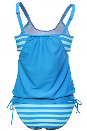 This is a tankini swimsuit made of polyester with a striped pattern and wire free support. It includes a padded top and panty and is available in sizes US 4-16 with corresponding bust, waist, and hip measurements.