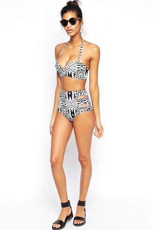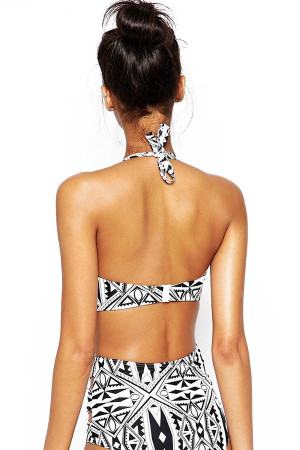 This sexy swimsuit is perfect for your summer essentials! Featuring; tribal totem print, halter tie and high waisted bottoms with cutout design.