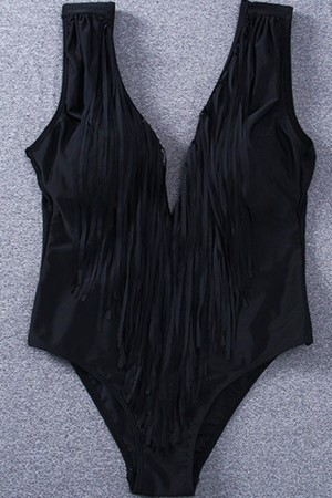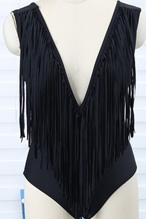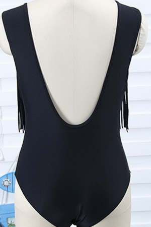 Elegant Black Plunging V Neck Fringed One Piece Swimsuit