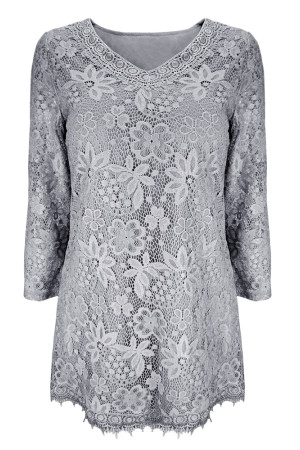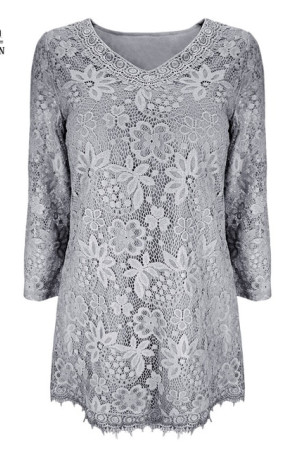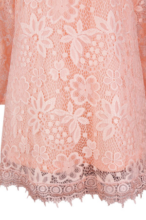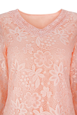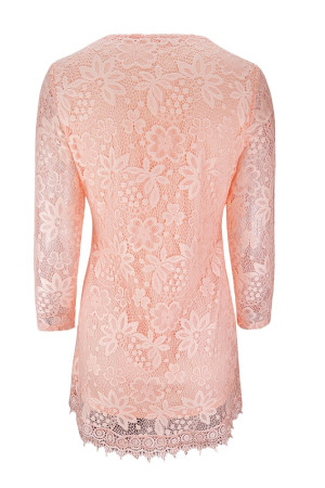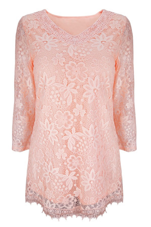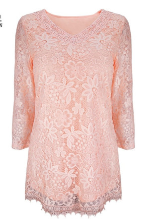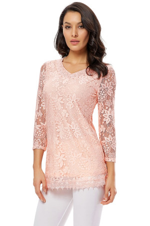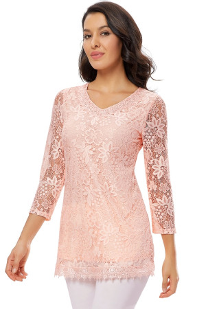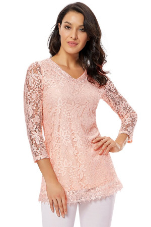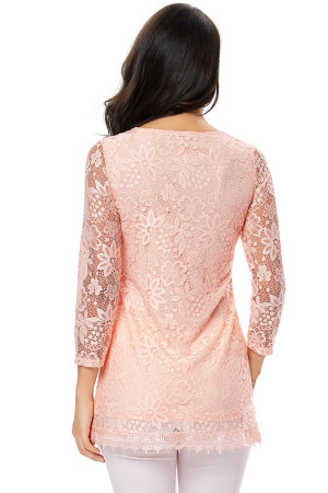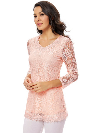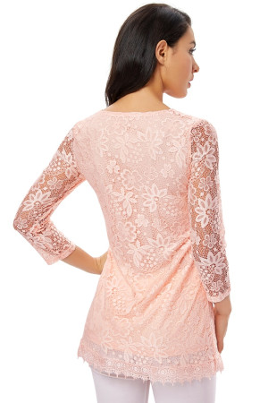 Women's Plus Size Vintage Floral Lace Blouse with Three Quarter Sleeves and Round Neck - Pink
