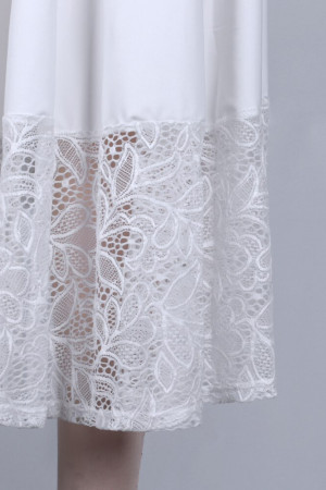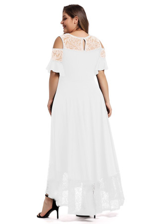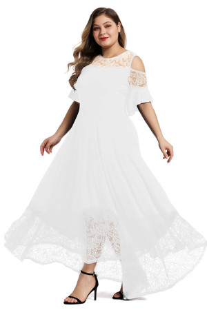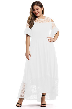 This plus size dress is perfect for any occasion, from clubbing to weddings and red carpets. It is made of high quality polyester and spandex, with a solid pattern and a sexy and club style. It features an O-neck, short sleeves, lace decoration, and a natural waistline. It is ankle-length and suitable for all seasons, both indoors and outdoors.