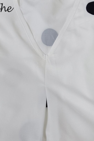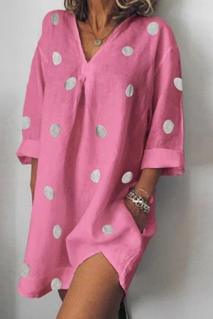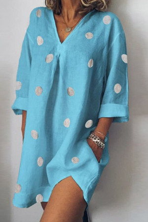This casual summer dress is made of polyester and synthetic fiber and features a V-neck, regular sleeve style, no decoration, pullover closure, wrist sleeve length, regular type, chemical fiber fabric type, natural waistline, and a print pattern.